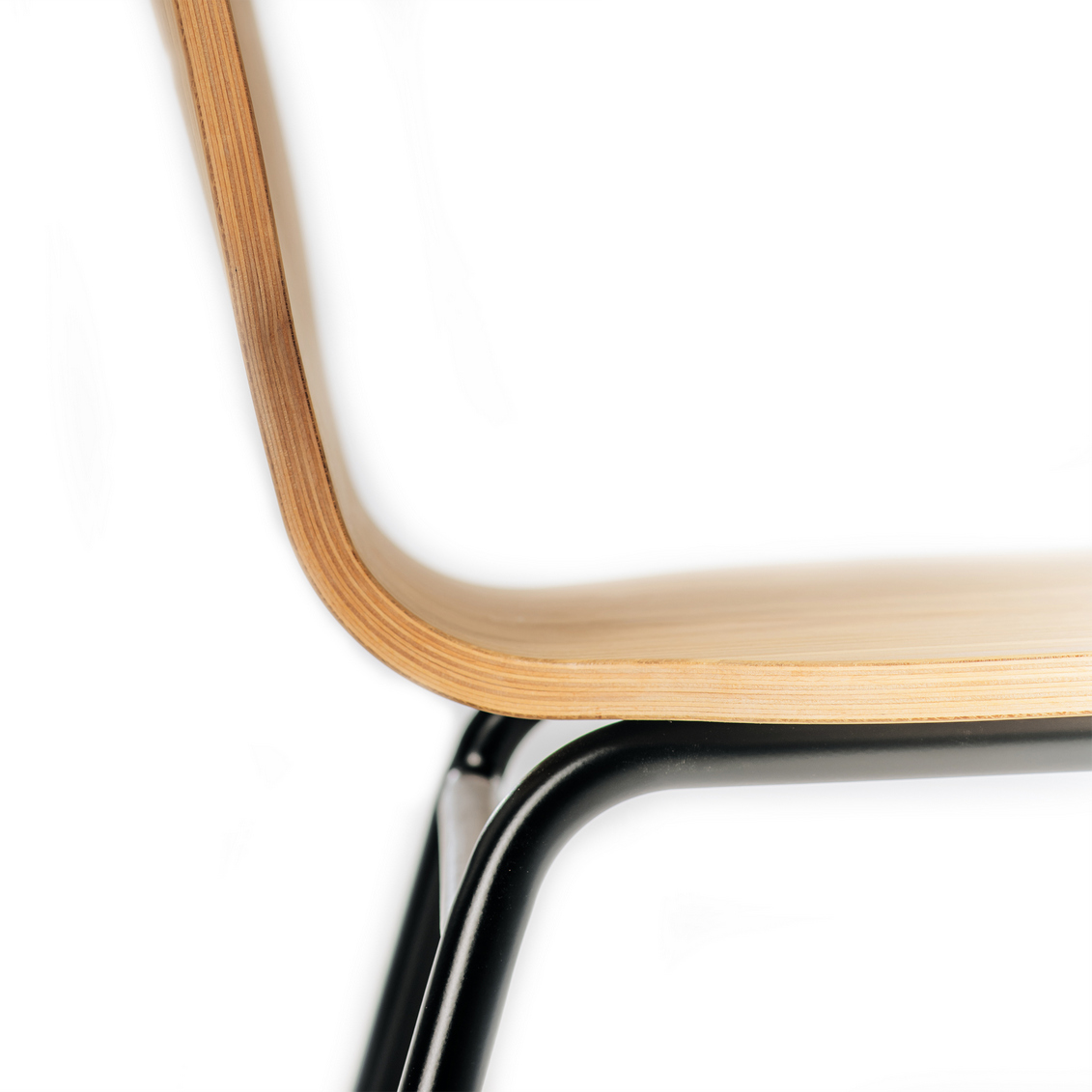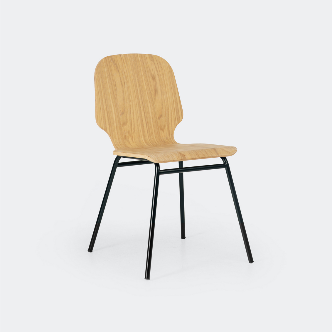 This piece features a sleek black metal frame, supporting a beautifully curved oak veneer seat and backrest.