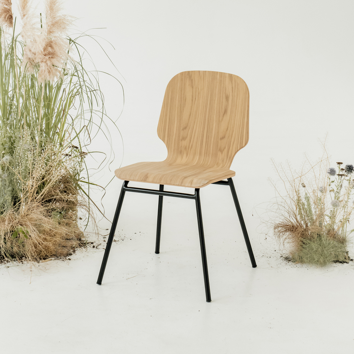 The Balena dining chair uplifts the natural appeal of oak with black lines.