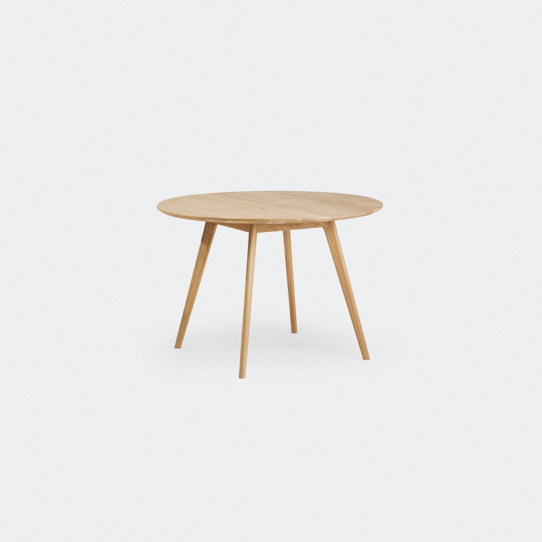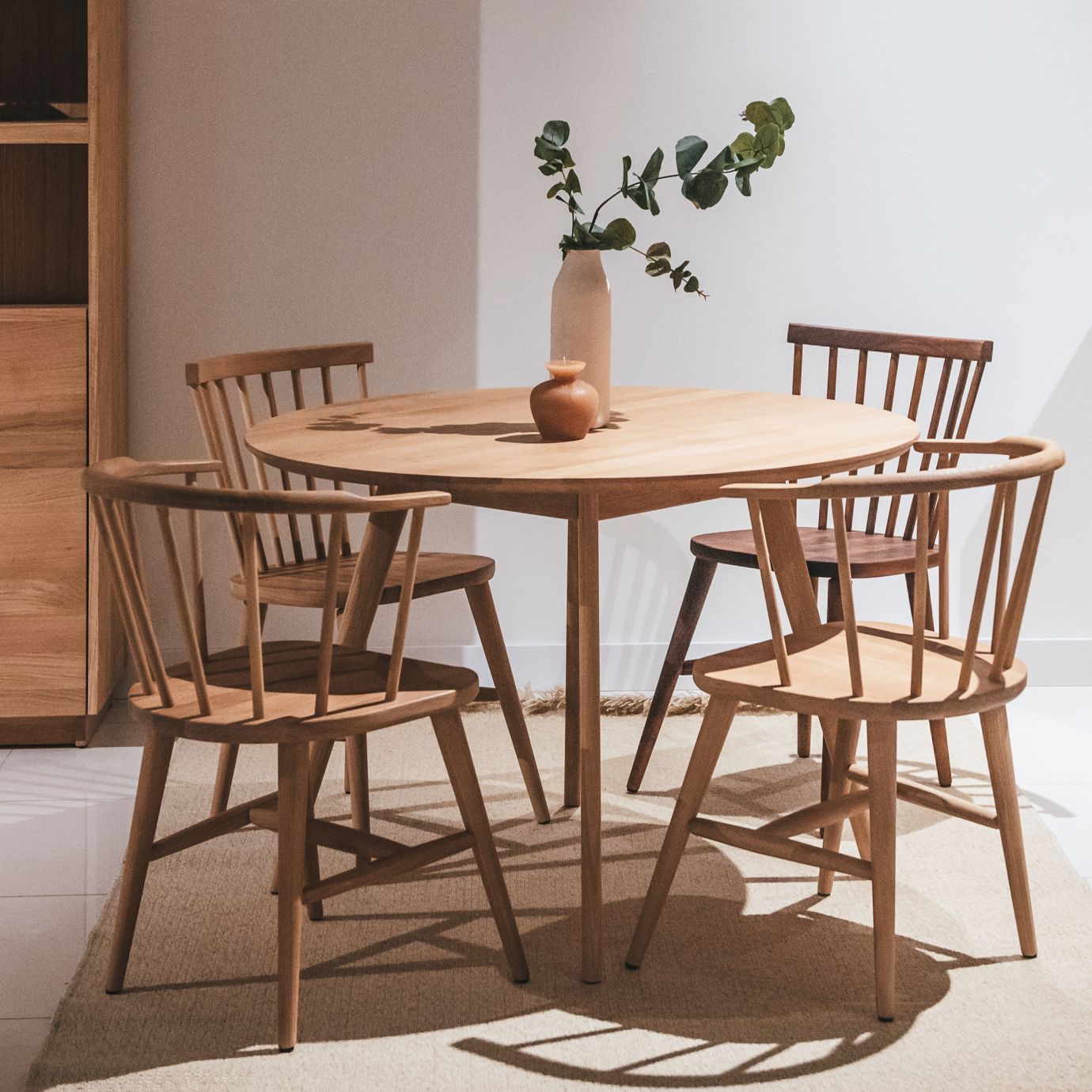 This round dining table extends a subtle welcome to those who value natural materials and fully enjoy the moment. Its sleek and comfortable tabletop is ideal for friendly conversations and family meals alike.