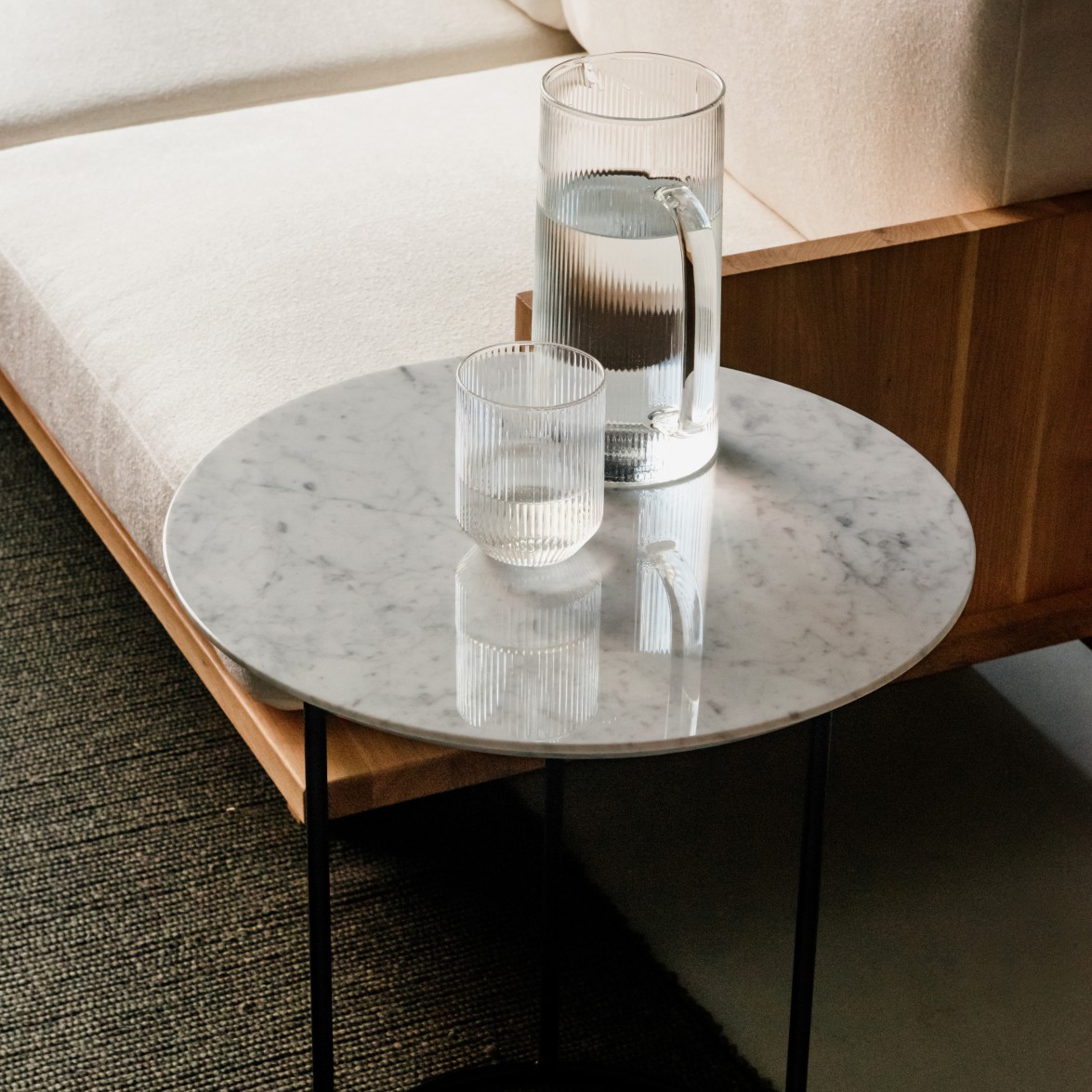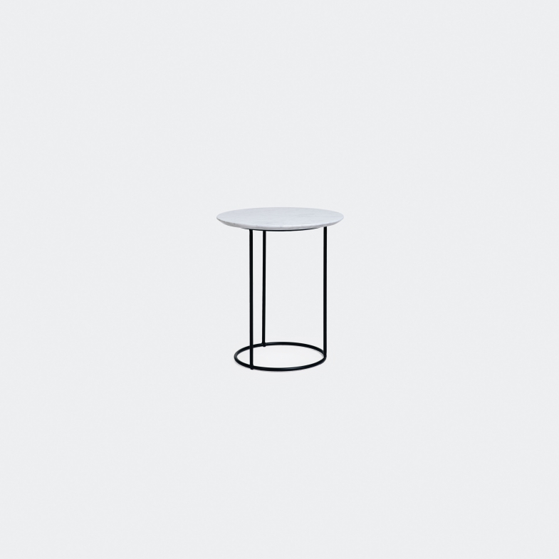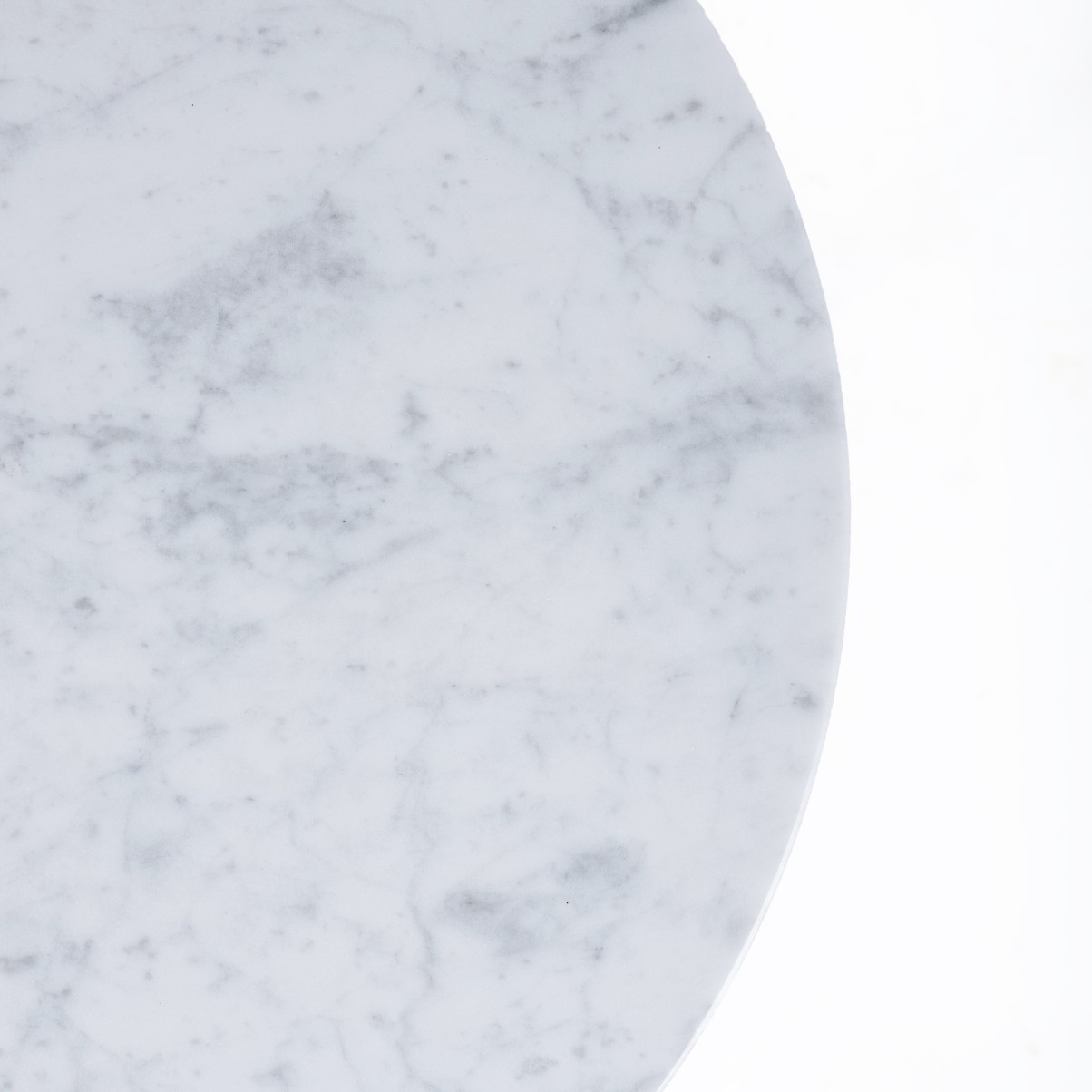 A round coffee table crafted in a classic style with refined touches, engineered as an indispensable piece that is always handy to have around. Its top, made of Italian Carrara marble, discreetly clings to authentic legs of powder-coated metal, giving it stability and a recognizable design touch.