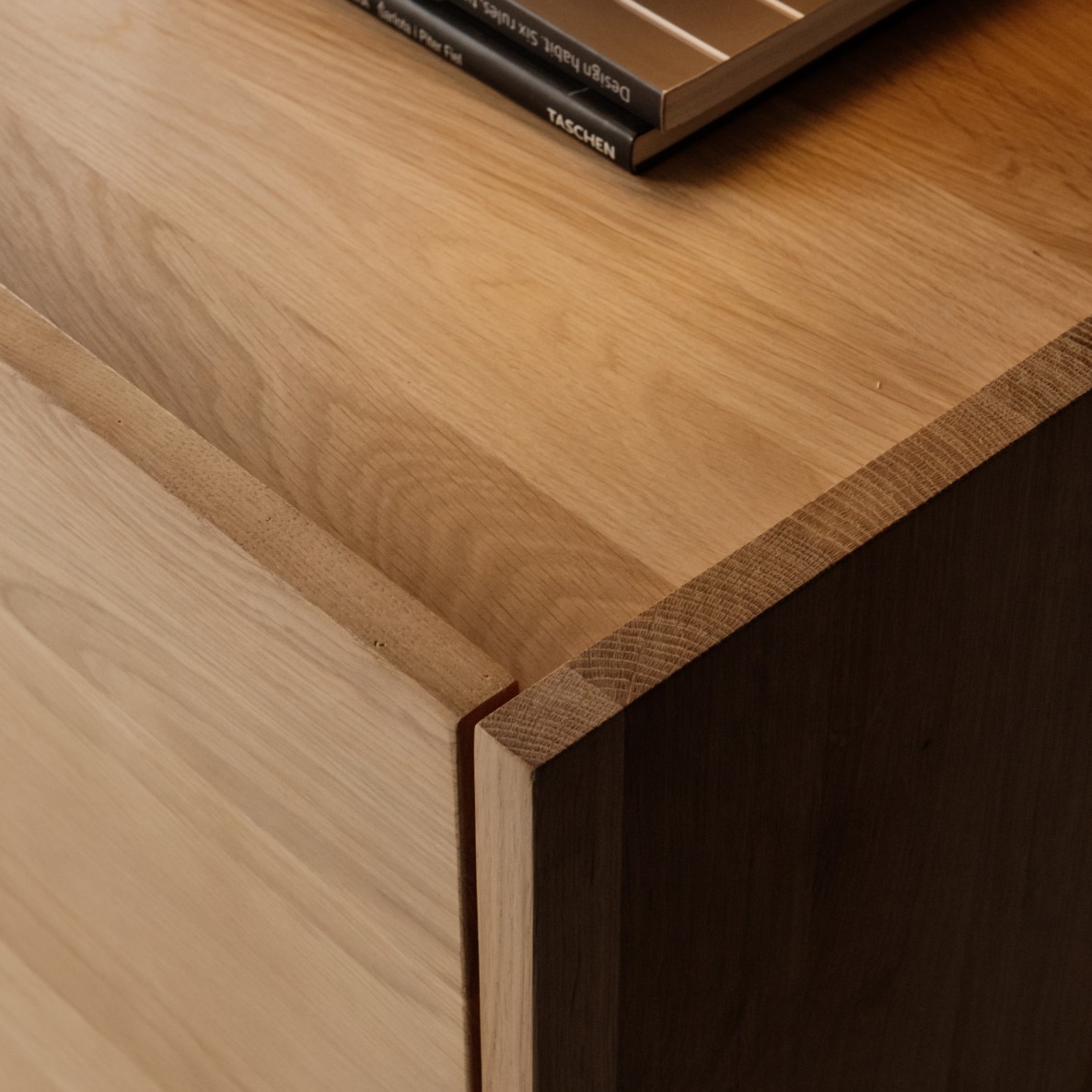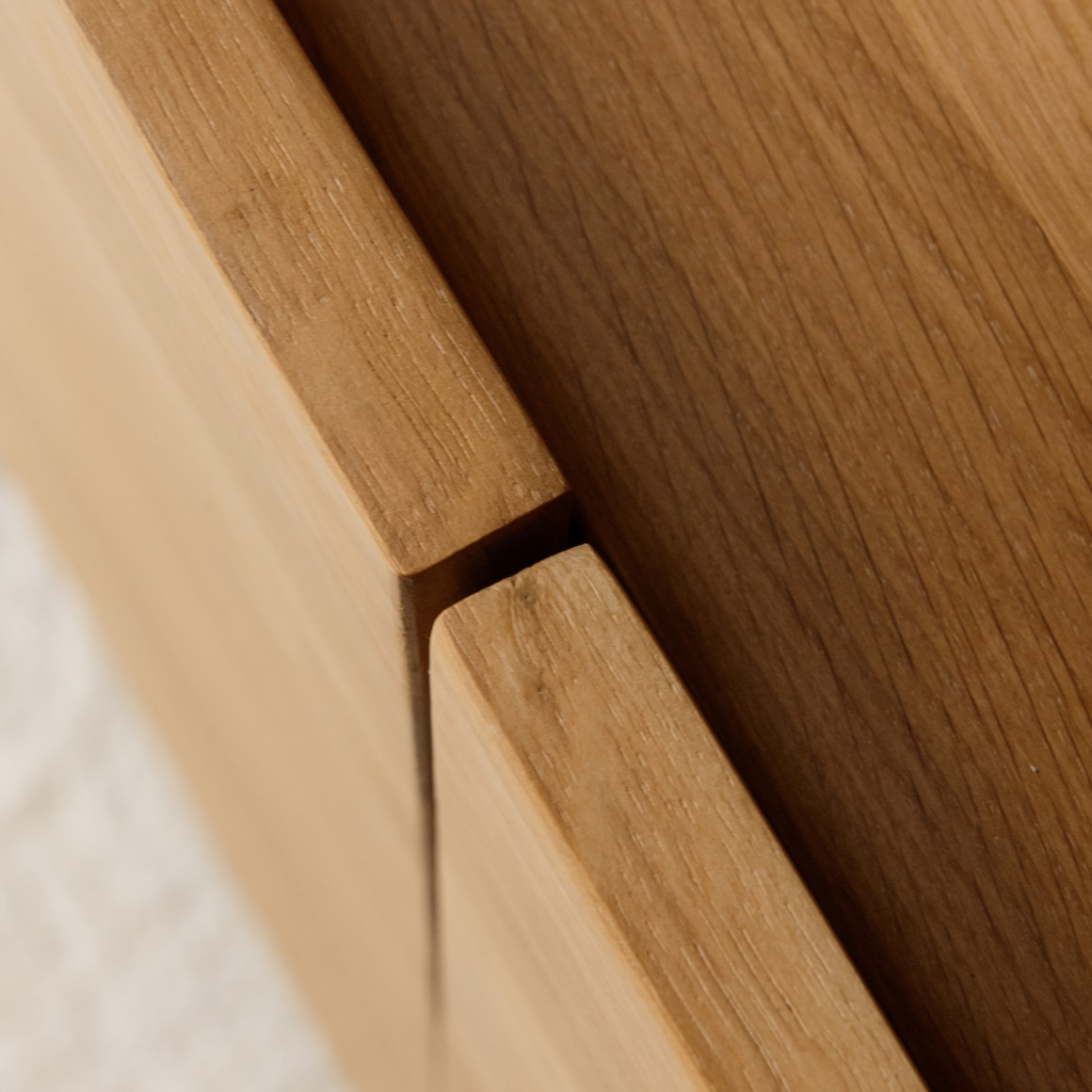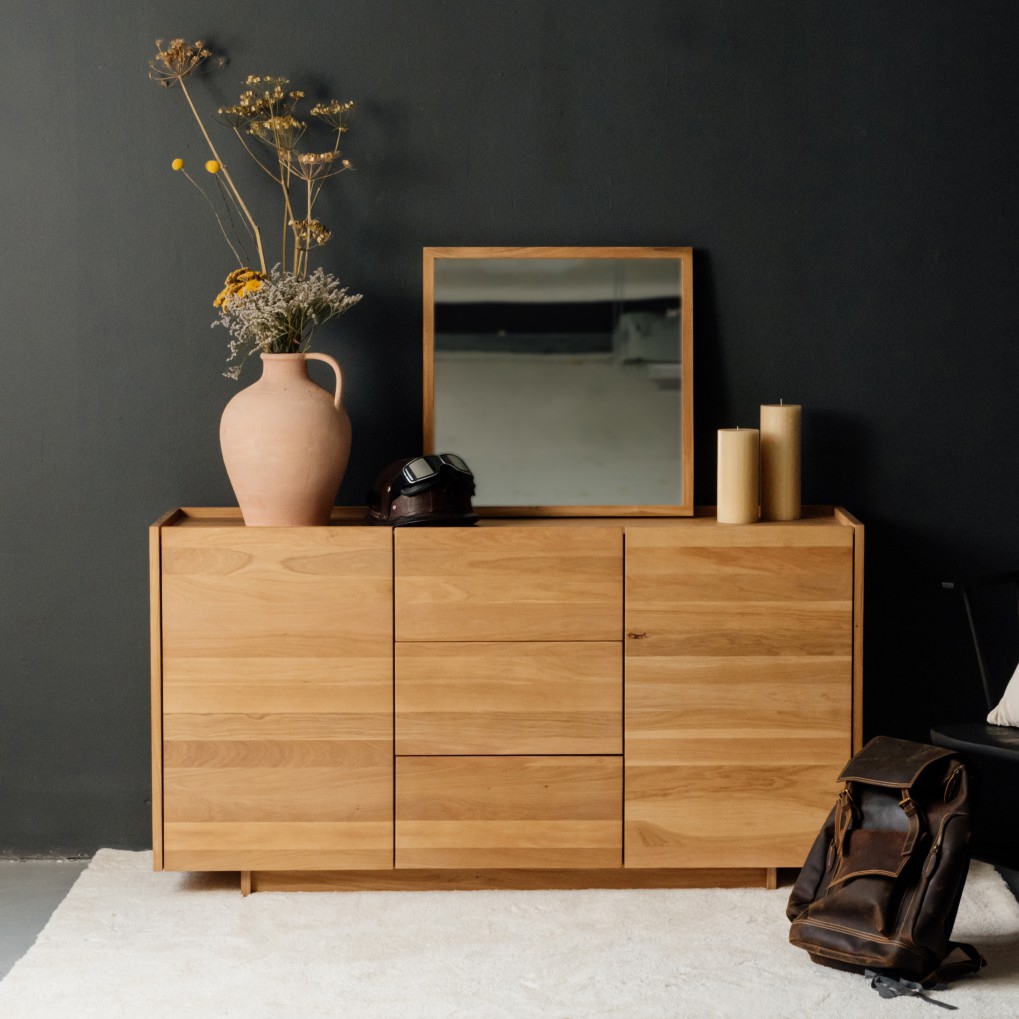 The interior space is divided into two sections separated by three central drawers, thus optimizing organization. Made entirely of pure oak, this sideboard ennobles the space with its natural shine, while maintaining lasting beauty and practicality.