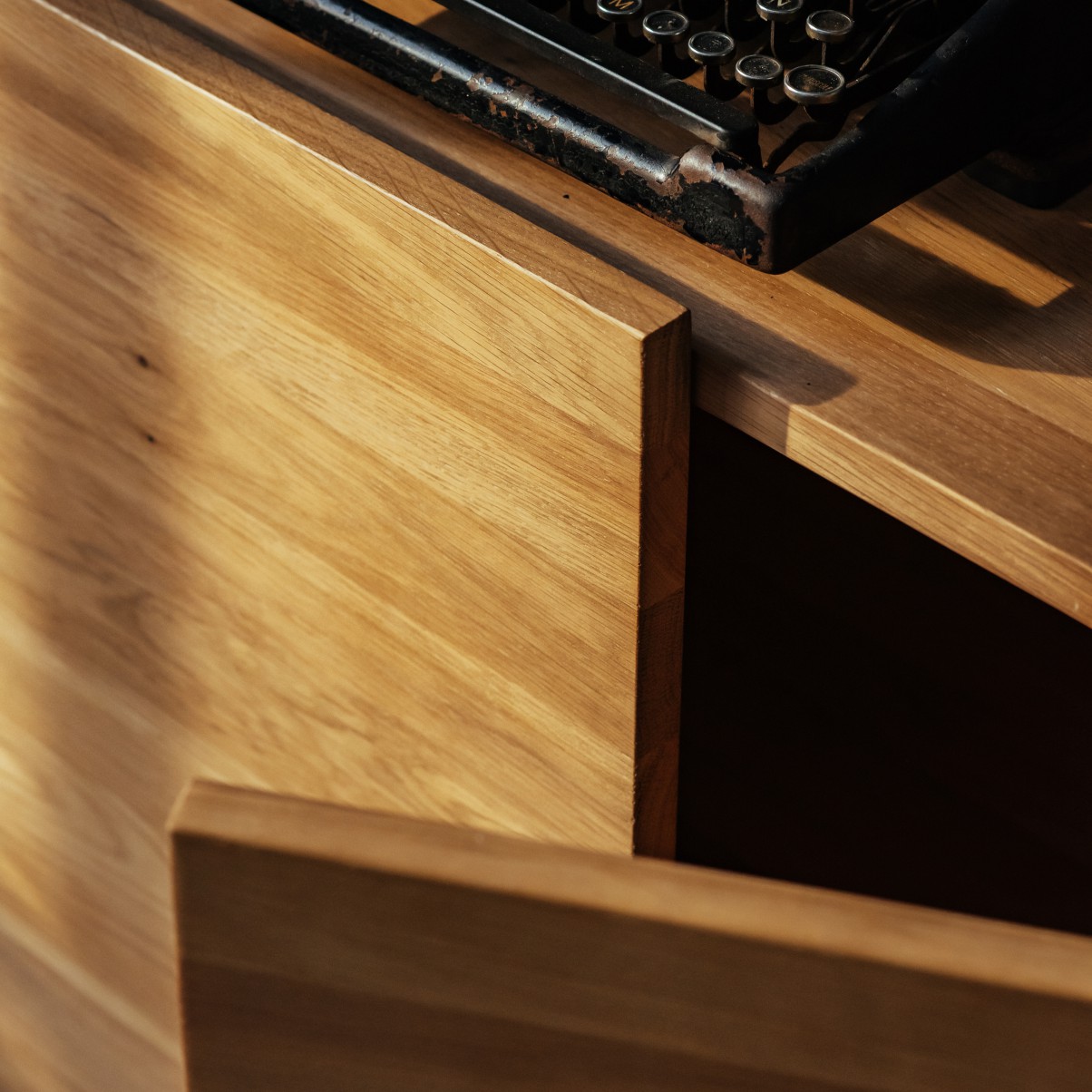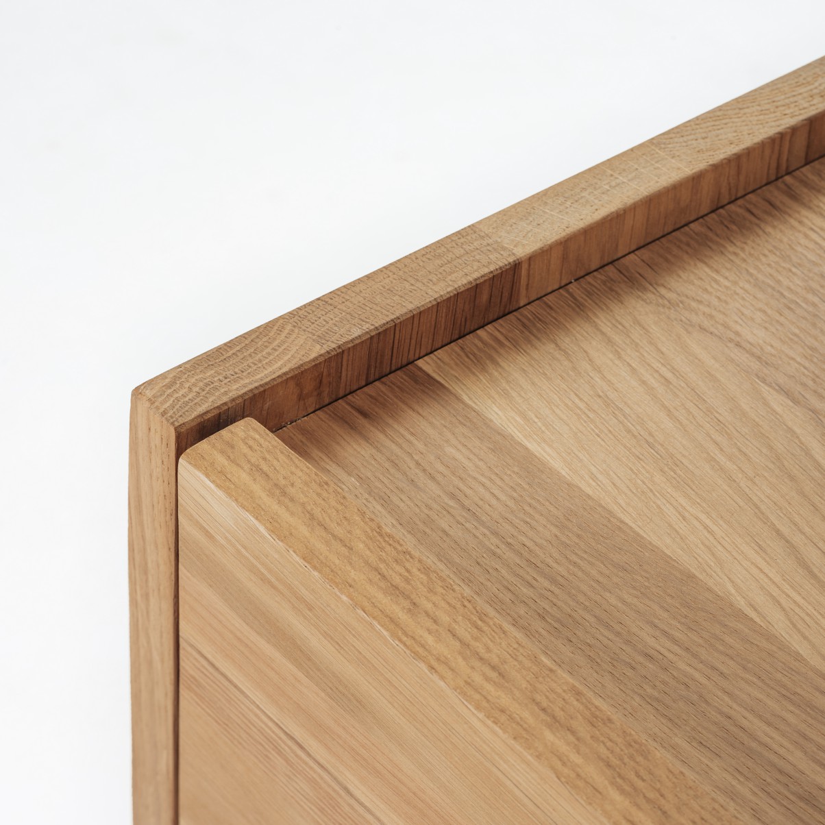 Its upper surface is subtly integrated into the structure, inviting you to place your favorite items on it, displaying them as subtle home decor. Combining minimalism and classic principles with skillful oak woodwork, this chest of drawers is built to last and discreetly dominate any space.