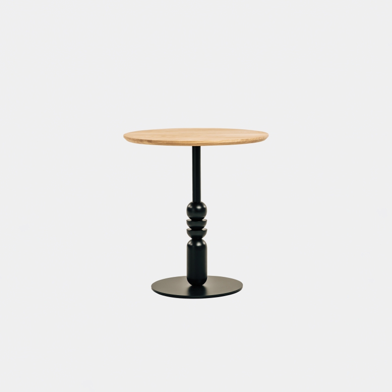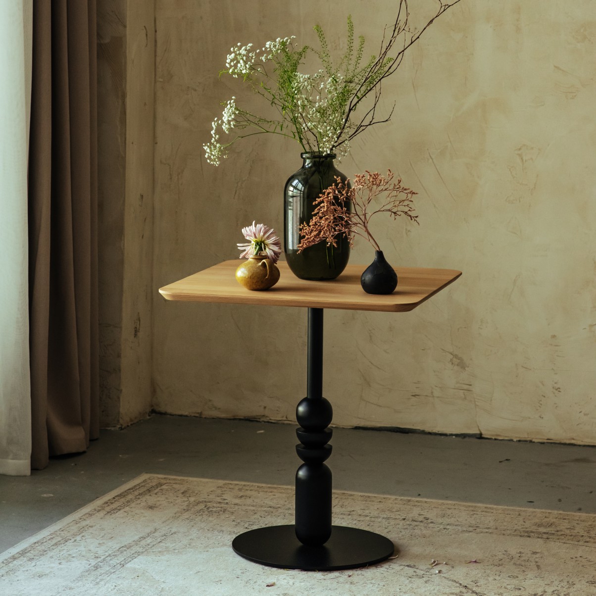 Crafted from solid oak with a natural oil finish for the top and a powder-coated metal totem leg, this table harmoniously blends timeless materials with contemporary allure. Standing gracefully on a single, beautifully designed leg, the totem table is a true masterpiece, effortlessly enhancing any interior. Elevate your space with this exceptional piece, where craftsmanship and design unite to create an unparalleled blend of elegance and functionality.